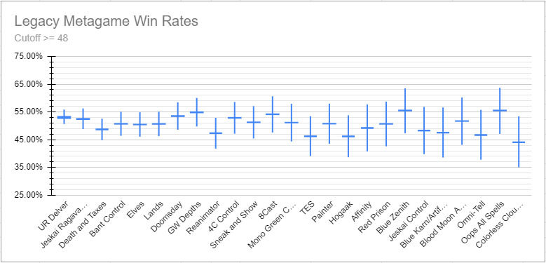 第二场永恒周末薪传赛有319人参加,再次感谢 Legacy Data Collection Project 对比赛数据的收集和整理,下面是套牌分布和胜率统计