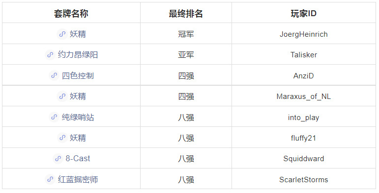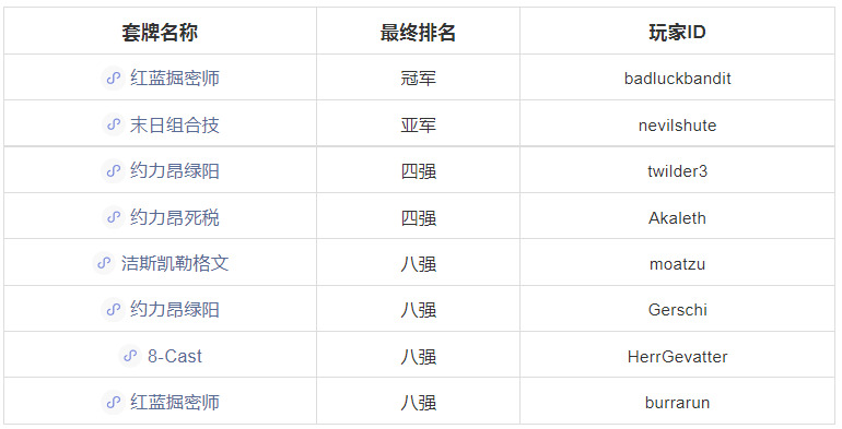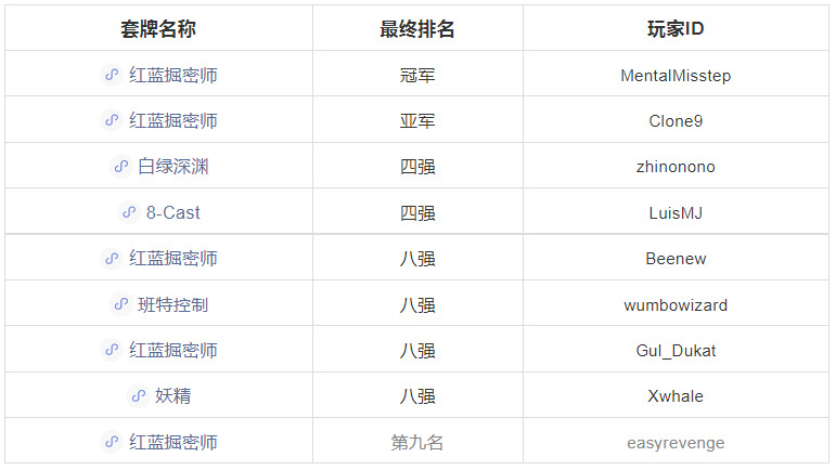 这场比赛中红蓝掘密师的占比和胜率都比前面两场要高。数量第二的是8- Cast,表现一般。赛前有人在推特上说,红蓝节奏系套牌可以使用熔岩镖针对妖精,许多人这么做了,所以这类套牌的胜率有所提升,而妖精的胜率大幅降低。这说明了红蓝节奏系套牌具有很高的灵活性,想针对什么就能做到,太完美了。比赛共进行10轮瑞士轮+八强单淘汰,下面是最终的八强排名