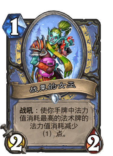 显然这张卡是去配合谜之匣或者新出的“场地”牌冰血哨塔的,我看到不少人说这张牌很强,但我有不同的看法。举个例子,比如哀绿这样的牌,给你手里的雕文减了一费,相当于减了50%,你手里的魔术戏法和霜冻射线配合哀绿从1费变成0费相当于减了“无限费”,1到0是一个无限的概念。这张卡给大法术法,10费变9费,9费变8费其实相当于减少了10%,收益真的不大。