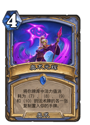 注意看,他的效果是复制,不像德鲁伊的灵瓜是抽出本体,法师抽出来的是复制。复制适合什么?适合慢速的资源卡组,这样的牌很适合大法术法。这一张奥术光辉就可以一卡补四张牌,这样大法术法就可以放弃一些过牌了,太强了。一定是大法术法满编的卡。