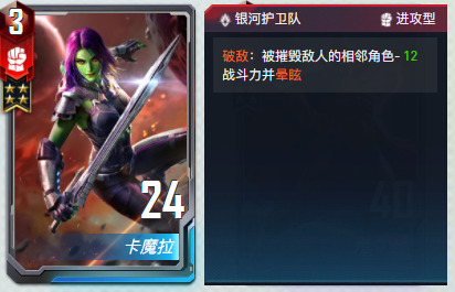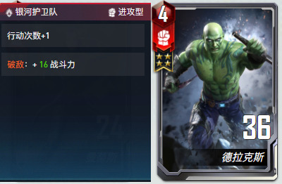 2.星爵提供红色进攻型角色以及装备卡“卡魔拉”“德拉克斯”“德拉克斯战刃”“勇度飞剑”以及援军角色“火箭与格鲁特”包括星爵英雄技能匹配度也很高“携手破敌”。