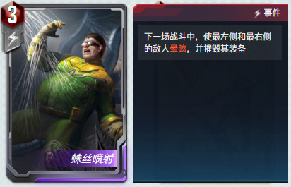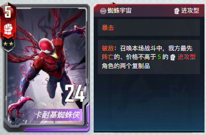 3.蜘蛛侠的进攻型角色附带暴击以及行动次数也是优选“蜘蛛女”“魔影迈尔斯”“小黑”“小红”“究极蜘蛛侠”本套卡组最重要的技能“英雄责任”。
