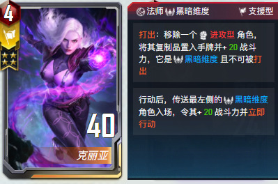 克丽亚(女儿)x4核心卡之一,与老娘相辅相成,打出黑化一个进攻型角色并强化,行动后再次强化召唤。