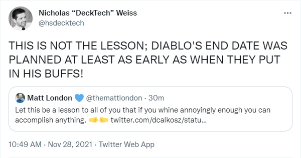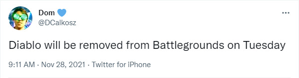 战棋设计师Dominic Calkosz今晨宣布了一个好消息,战棋模式将于北京时间下周三移除迪亚波罗!在推特社区的连天抱怨之后,同时也随着感恩节假期的结束,开发团队终于要开始解决问题了。