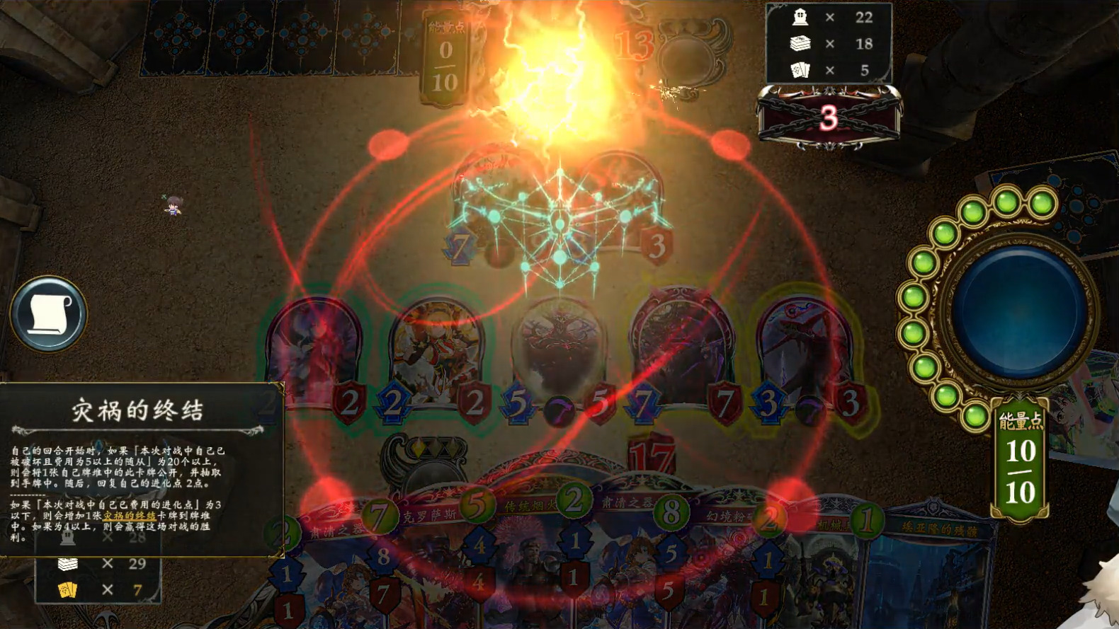 如果有机会触发灾祸的终结的“瞬召”能力,要腾出手牌空间,并用够3个进化点,以便尽快达成特殊胜利。