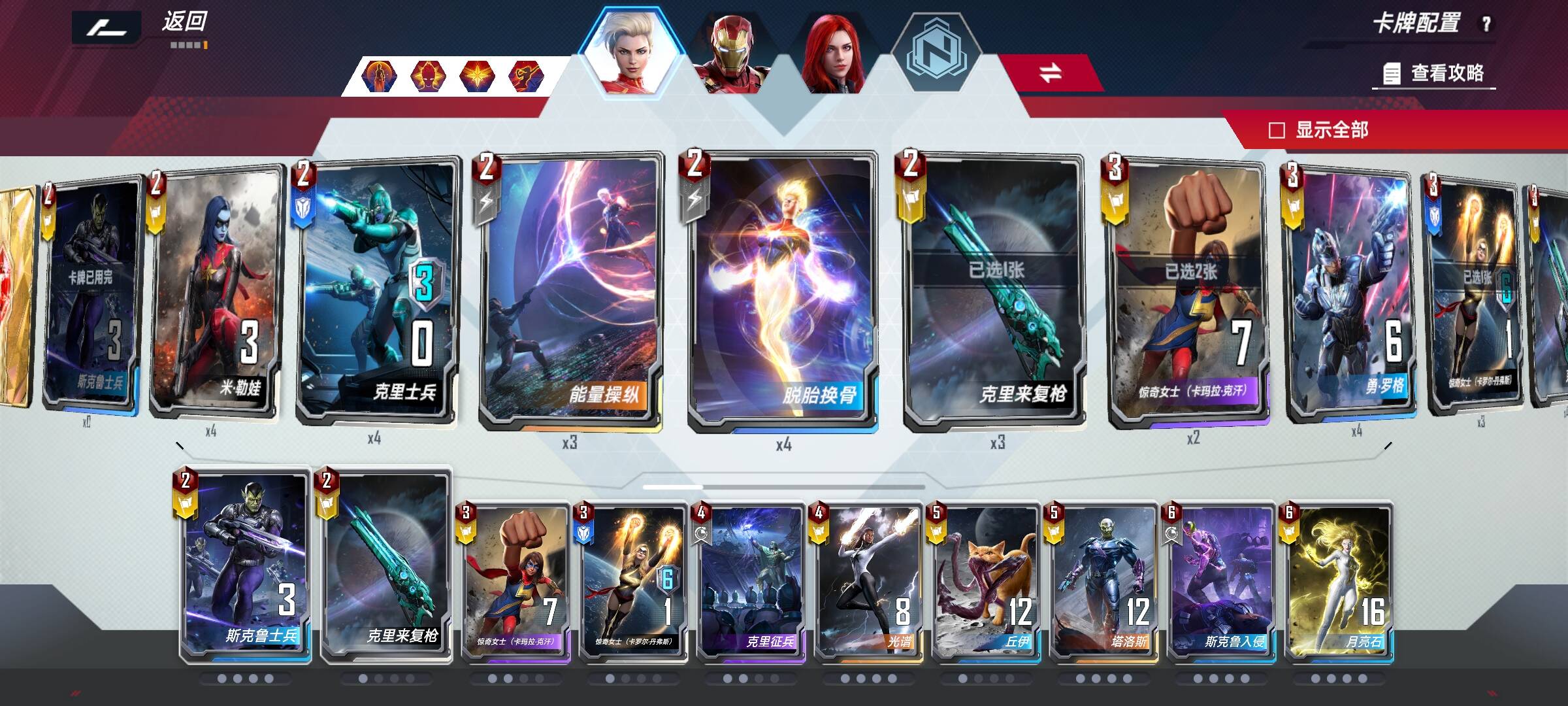 2费配卡放弃了脱胎换骨,因为本卡组并没有带钢铁侠的小辣椒,在前期只有超智机构士兵这一经济操作,前期没有足够的经济支持,且脱胎换骨需要的卡三本出光谱操作与本卡组节奏不符。北辰试过带脱胎换骨和三费克里手枪来搭配卡组外的在编人员-罗南,但实际操作发现过于牵强,故放弃。2费卡池不建议修改,斯克鲁士兵可以带2或3张,只影响后期强度。