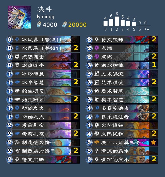 这套卡组是我看过主播直播以后根据记忆自己组的,后来发现和职业选手的卡组也就只相差一张卡(职业选手多带了一张冰甲少带一张冰风暴),整个过程中我也没有改动过任何一张卡,说明现在决斗法的构筑基本没什么调整空间了。我的单冰甲双冰风暴构筑是因为单纯觉得冰甲费高不灵活,实战也可以根据具体环境选择职业选手的构筑。