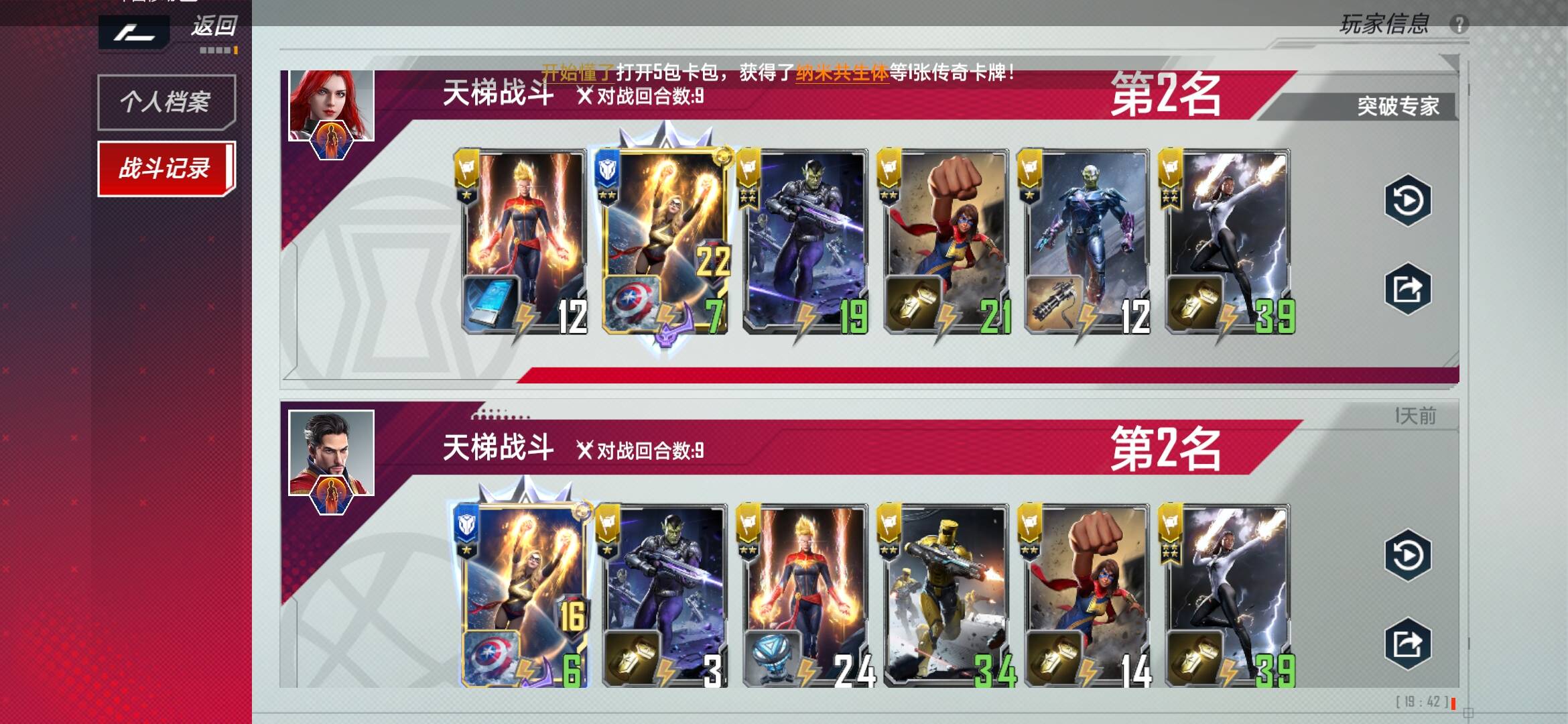 我在S1赛季上王用的复联,那个时候吃了蚁人和雷锤的版本福利,S2版本打的比较杂,在经历了凯旋统治期还有光谱统治期的混合暴打后,最后选择了**万能刺的复联以及多动惊这两个卡组上了王。