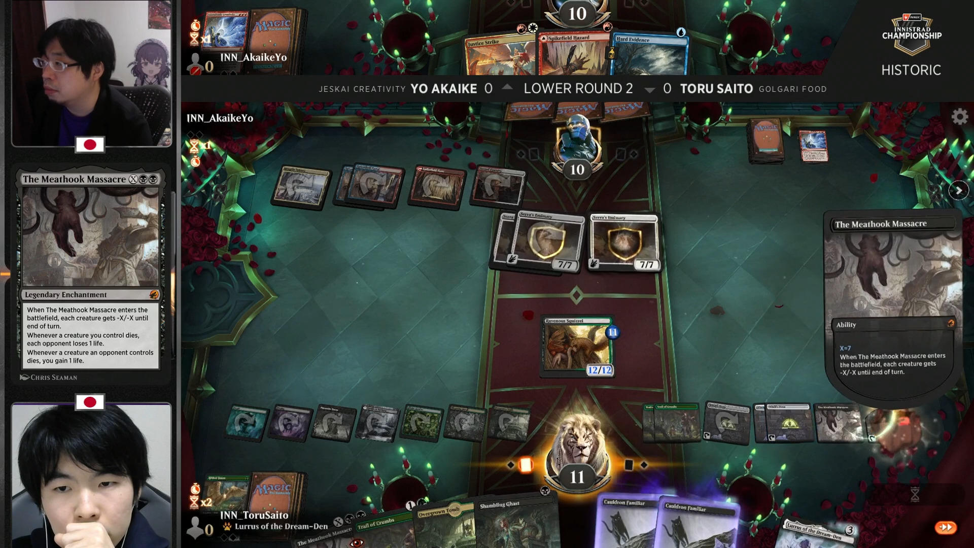 赤池庸操控八强唯一一套无畏创新对阵齐藤徹,在结算无畏创新砸出两个天使后,敏锐的发现对手下回合可以下地使出X=7的肉钩大屠杀,于是再次无畏创新指自己的衍生物和对手的金鹅,不料却把金鹅变成了另一只金鹅,下回合果不其然被齐藤徹一个9费的肉钩一杆清台,憾负。