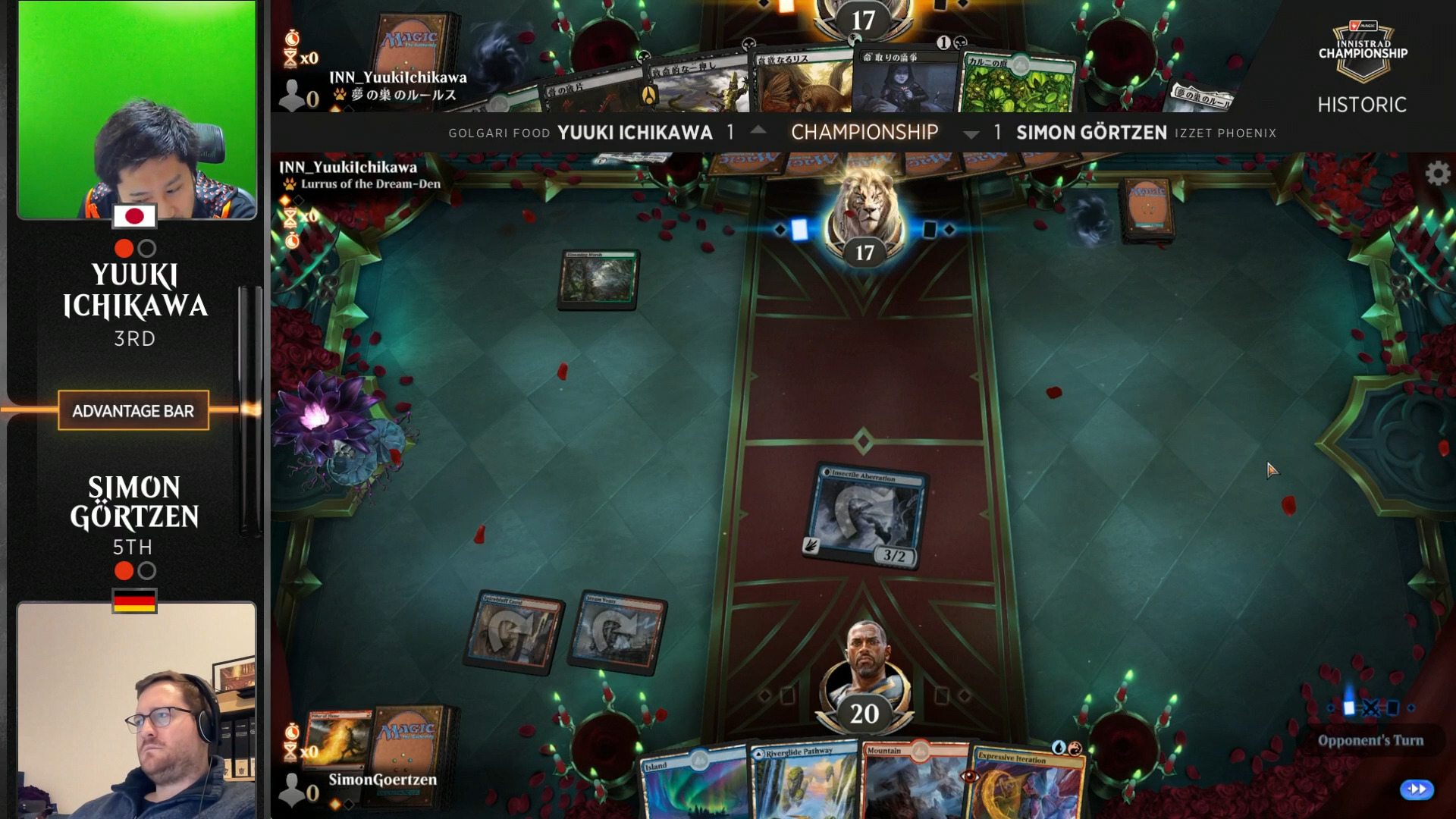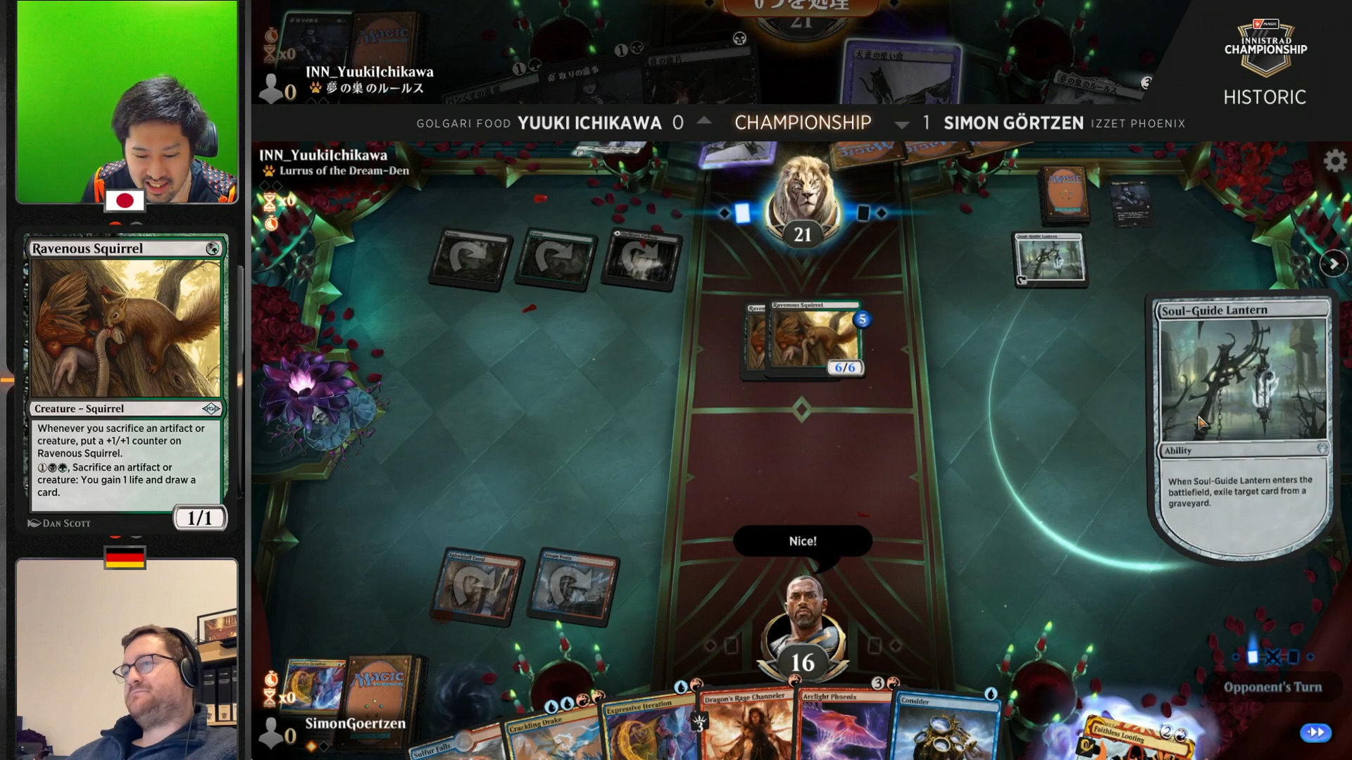 最后一个BO3中,Simon抢先拿下一城,但随后被市川天胡开局,双贪食松鼠+鼎镬佣兽,三回合致命争执接导灵明灯直接做出两个6/6巨兽,坟场被清连不洁热火救命的机会都没有,短短两分钟就来到了第三局的决胜。