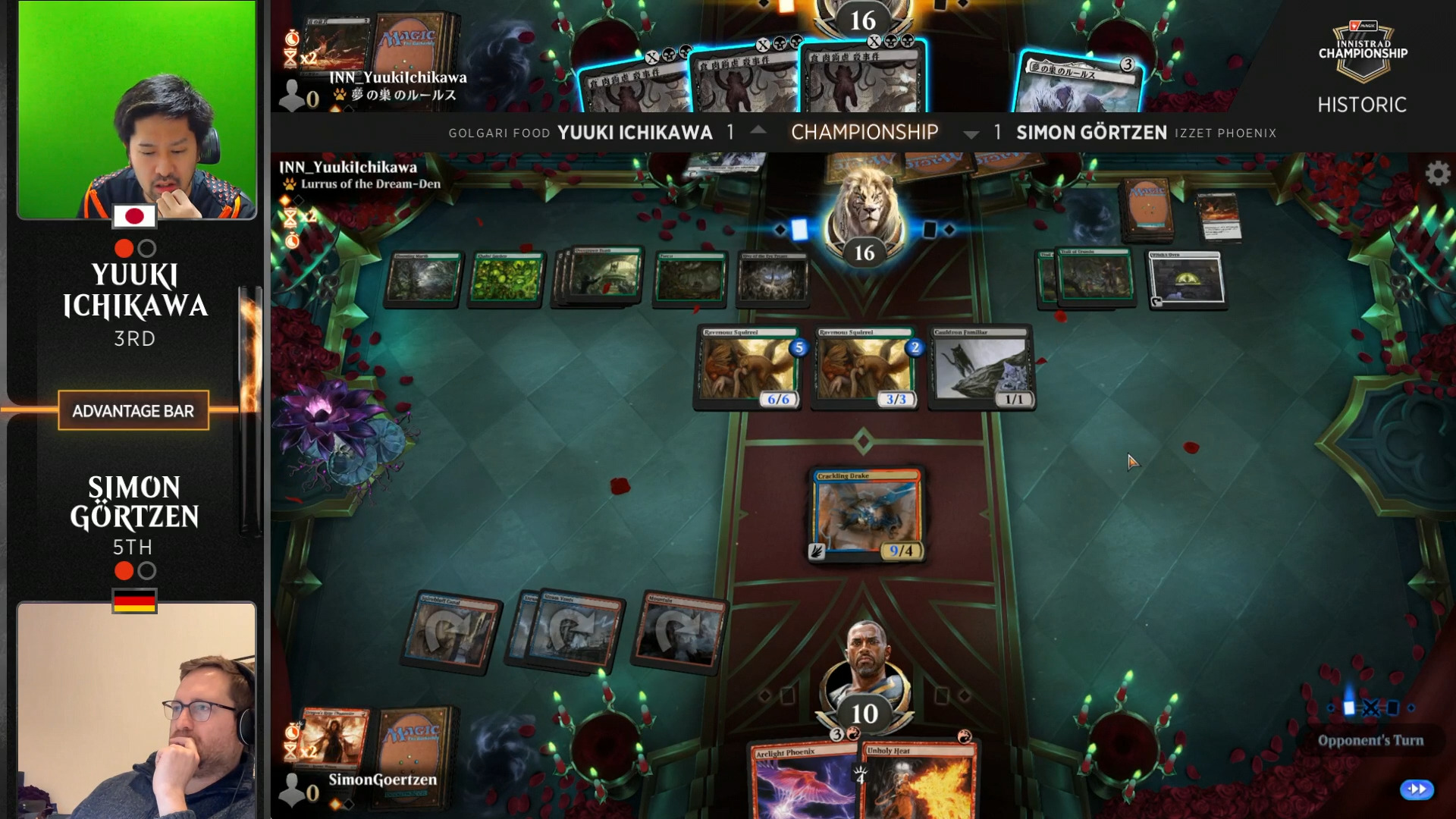 市川游刃有余,稳扎稳打,几个回合过去,场上生物、地和手牌都有对面两倍之多,比赛已经毫无悬念。