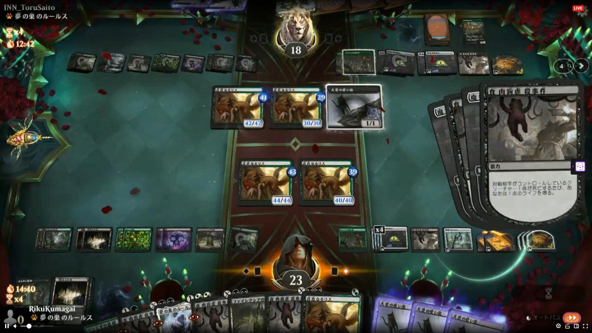 然而我们知道,日本人版本的黑绿食品满编了送终一击和肉钩大屠杀,到4回合才出过两个生物的Simon很快就被市川杀秃,随后进入黑绿的神器结界码场节奏。