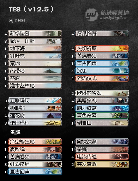 TES是薪传里最好的倒胃口牌。除了有五彩和蛋白玛珂做额外的莲花瓣外,TES的平均法术力值压得也很低,让倒胃口能抓很多牌。要记住的是,倒胃口是个瞬间,我们可以响应对面的脑激,或者在对面回合结束时开动。在你没手牌时,倒胃口和五彩玛珂还有给小配合,下玛珂,响应玛珂倒胃口,响应倒胃口掰狮眼钻,在倒胃口补完牌后结算玛珂异能压印个东西。
