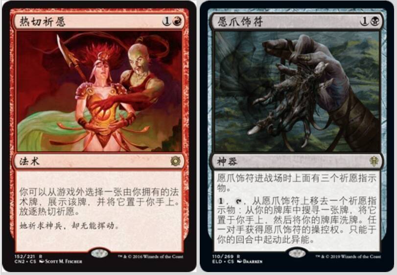 这是一张定义TES的单卡。在TES中,你的主牌可以不带互动咒语,因为热切祈愿可以帮你从备牌里找到解,或者提供一个PlanB。热切祈愿作为表里最厉害的单卡之一,可以让你在G1的时候就能去除掉对面锁住你的东西,或让你有机会能打败对方主牌的夏色帘幕。热切祈愿还能提高牌库里的威胁密度,比起其他的风暴牌,TES可以用更少的时间来过牌找威胁,从而更快的干掉对方。它虽然集风暴引擎,制胜,保护,和去除于一身,但我们的备牌还是不能全部塞满红祈愿的目标,一般来说6-7张就够了。