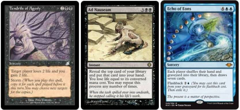 主牌的苦痛卷须和愿爪饰符亘古回声的配合非常好。在回声后,你获得胜利的方式更多了,也更简单了,有时你不再需要先用愿爪饰符或红愿来找风暴咒语,很有可能在亘古回声的7张牌里已经抓起来了卷须。这避免了对手在抓了7张新牌后找到康,从而让你停牌的可能性。在对抗蓝牌时,让对面用康帮忙凑风暴,先释放夏色帘幕骗出对面的康,然后再用愿爪饰符找出卷须斩杀。