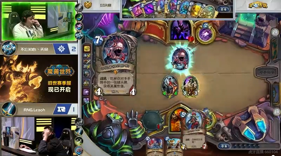 天命这次以邪能瞎、控制暗牧等非主流卡组构成的控制阵容从一开始就是整个季后赛的亮点。尽管首轮刚好撞上极大劣势对阵,但毛色不纯的连连失误让他大难不死,后面就有了阵容优势。在和Leaoh的决赛中,这个阵容尽管没有优势,但天命也展示出了它们的独特风采。