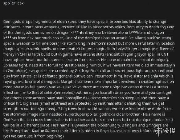 荣获金摇杆“最受期待游戏”的《艾尔登法环》预计明年2月才推出,尽管此前举办了beta测试,但游戏的剧情走向、Boss阵容、后期内容等依然保持神秘。而几天前国外有人称:《艾尔登法环》游戏内容遭大幅泄露,很多详细信息在网上传开。