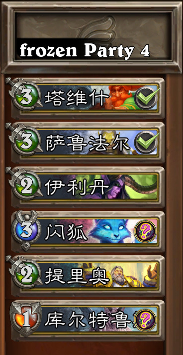 阵容选择——伊利丹(*)、洛卡拉(*)、吼爹(格罗玛什·地狱咆哮)、曲奇、弗丁、考内留斯·罗姆(*)。(星号为常见首发)