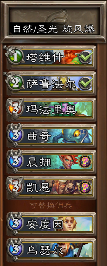 我们先说一下前两套的阵容思路,具体是针对暗影剑、蛋冰等卡组首发萨鲁法尔+雷矛+晨拥(有时根据对手红绿蓝数量变阵),后续使用自然队或是圣光队进行赖场(提示,曲奇、牛都有自然)。