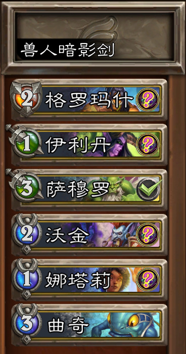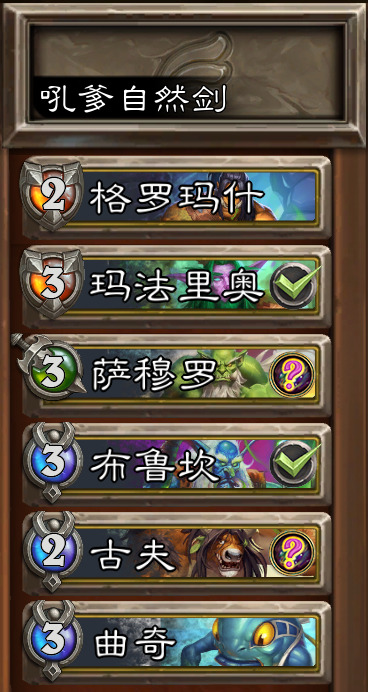 阵容选择——吼爹、玛法里奥、剑圣、布鲁坎、古夫、曲奇。卡图中打钩的是首发卡,问号的是可能首发的卡,名称前的数字是装备选择。(首发通常有两种,一种是玛法里奥(大德)+布鲁坎+古夫,一种是大德+布鲁坎+剑圣萨穆罗,具体详情请见阵容思路栏)