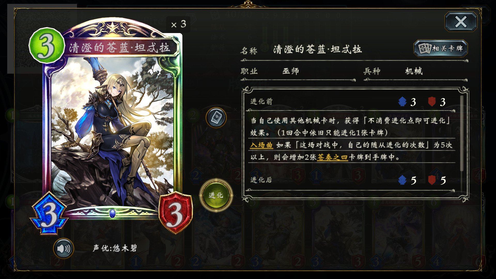 清澄的苍蓝·坦忒菈 (下文简称二姐)是这套卡组的绝对核心,自带电表倒转效果等于一个1费55突进,前期拍出可配合低费机械卡白嫖进化,后期达成5次进化登场获取大量token苍奏之四。苍奏是非常优秀的补刀法术,也是中后期重要的伤害来源,与和平维系者·宾森特 配合尤佳,在宾森特主战者效果(下文简称言灵)加持下清场+蹭血,为虚无的嚎风·格里姆尼尔 (下文简称风军)斩杀开路。
