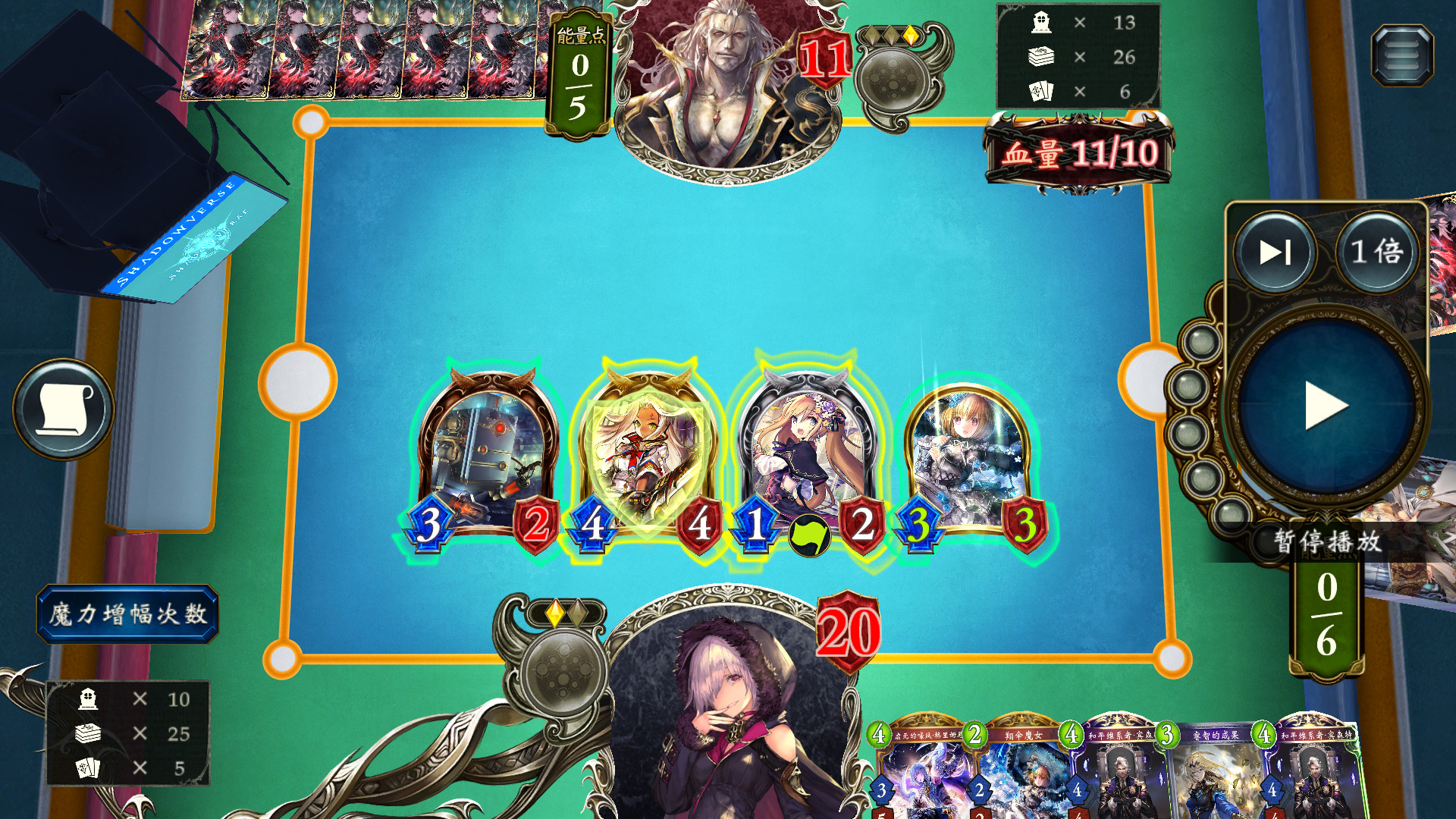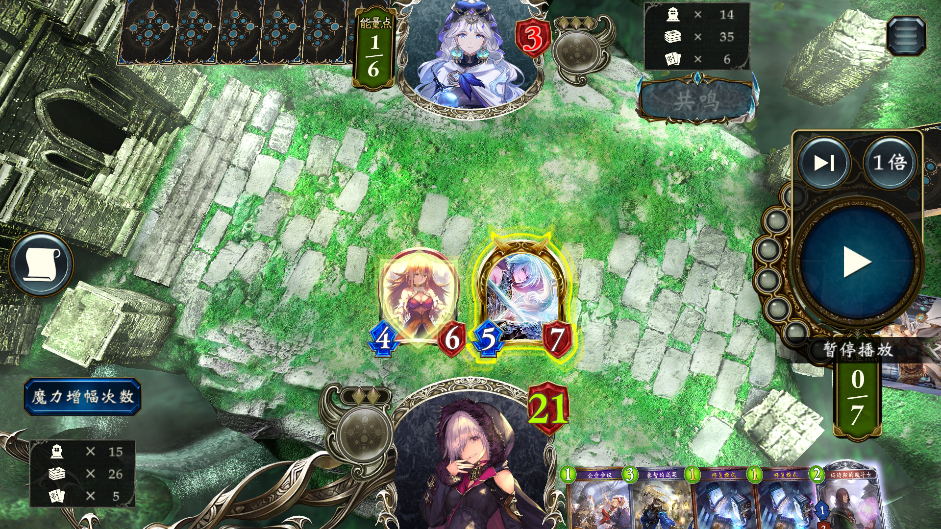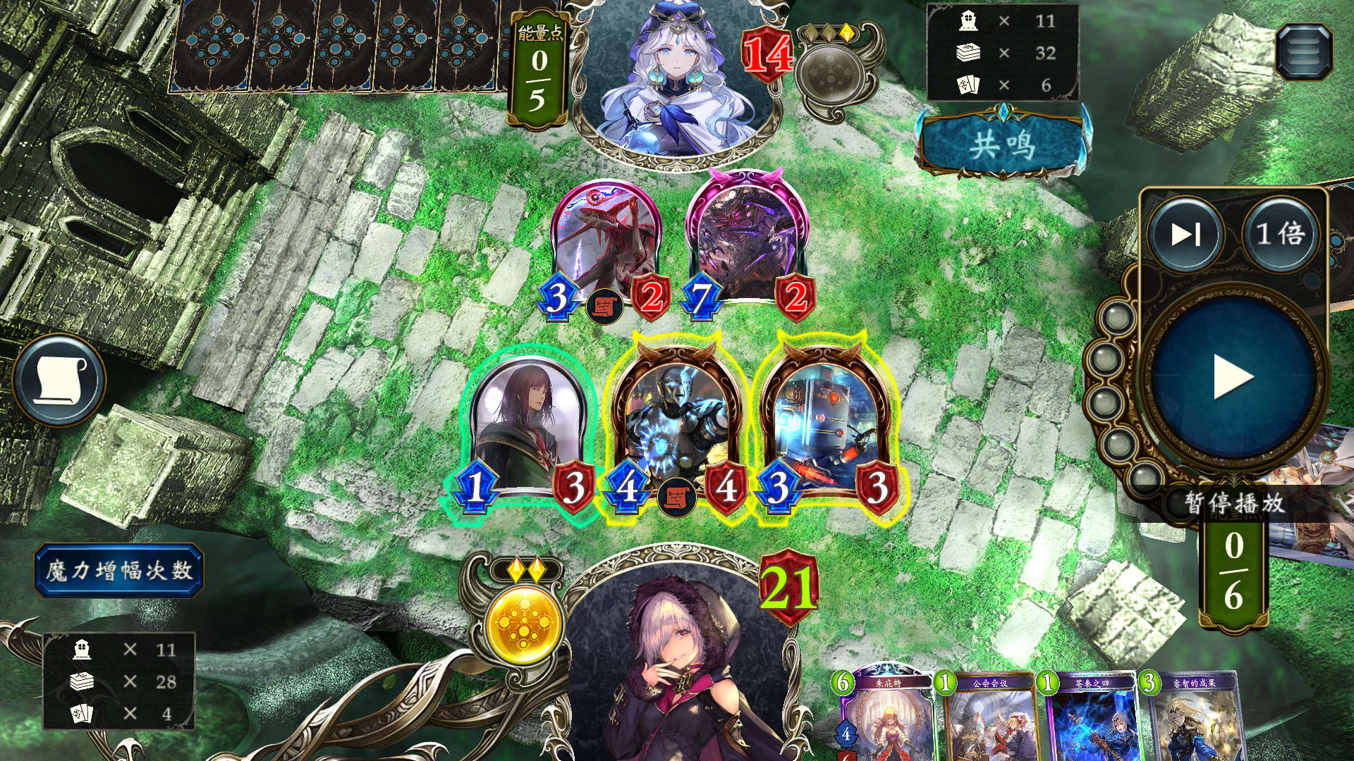 这里对面打出最强一波攻势。此时我已经用过两张修复模式,只需先下载具+宾森特免费进化,撞44,然后下魔术师,再下残骸获取第三张修复,打出修复触发言灵,3点AOE,同时触发魔术师进化,最后用公会会议触发魔术师打2解掉最后一个11杂毛,并将血量抬到14避免被风军斩杀,甚至还能再补一个魔导士过牌。