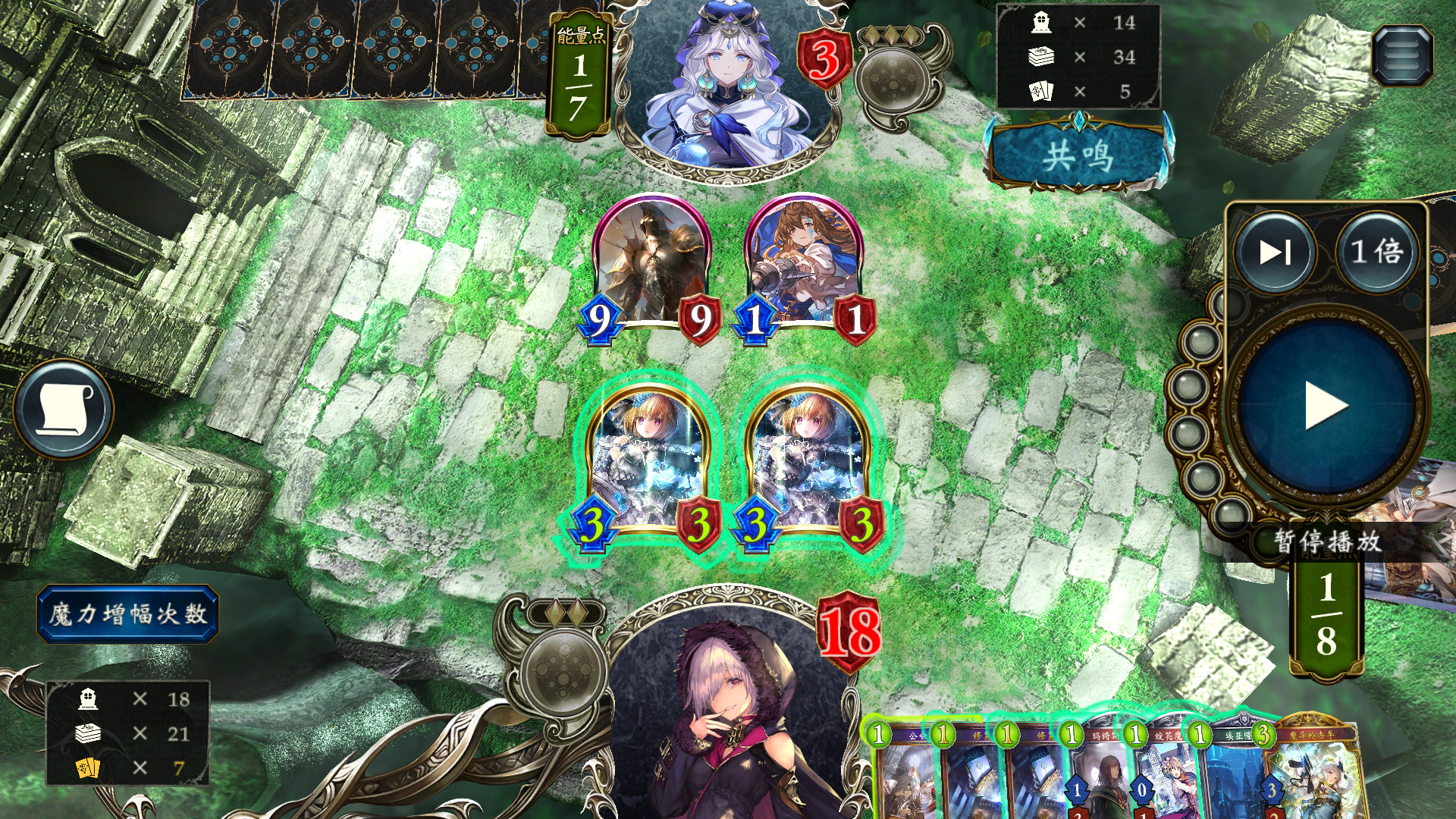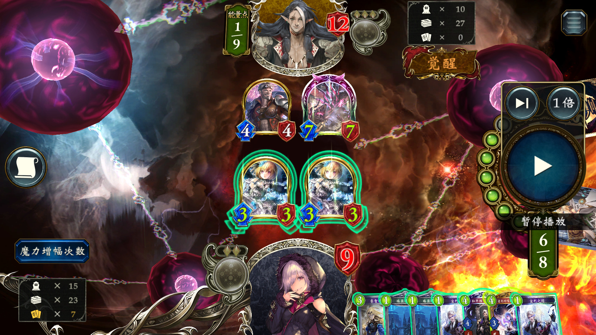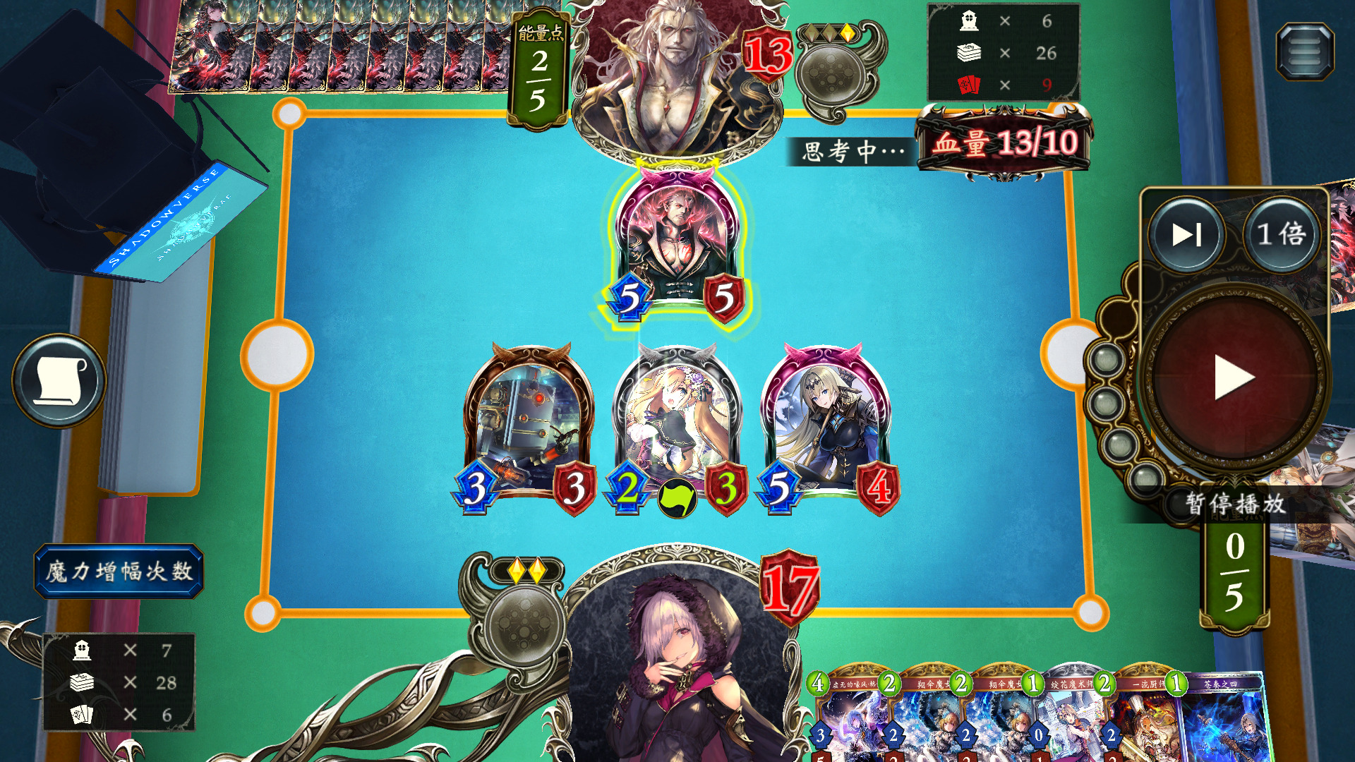 同样地,这里我们已经上过言灵,用过两张修复,先用一个33撞77,拿修复触发言灵,全场打3,怪剩余血量1+1,人剩余9血,下风军,刚好剩3血,另一个33踢脸斩。