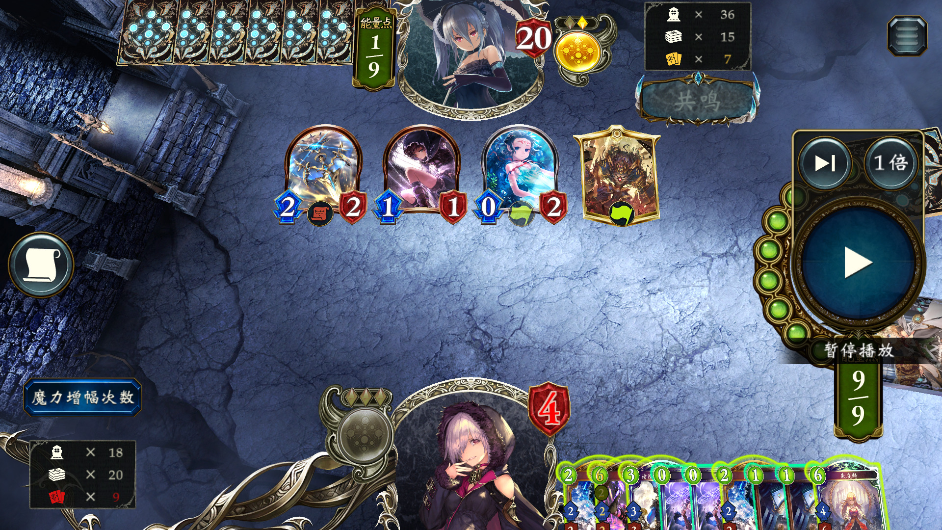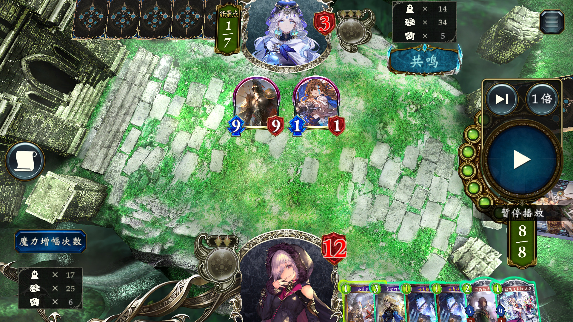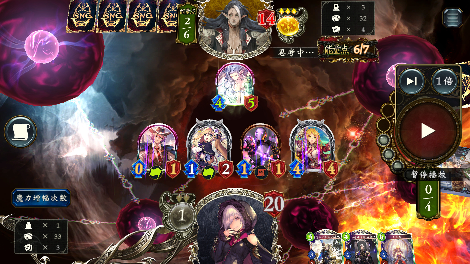 同样地,这里我们已经上过言灵,用过两张修复,先用一个33撞77,拿修复触发言灵,全场打3,怪剩余血量1+1,人剩余9血,下风军,刚好剩3血,另一个33踢脸斩。