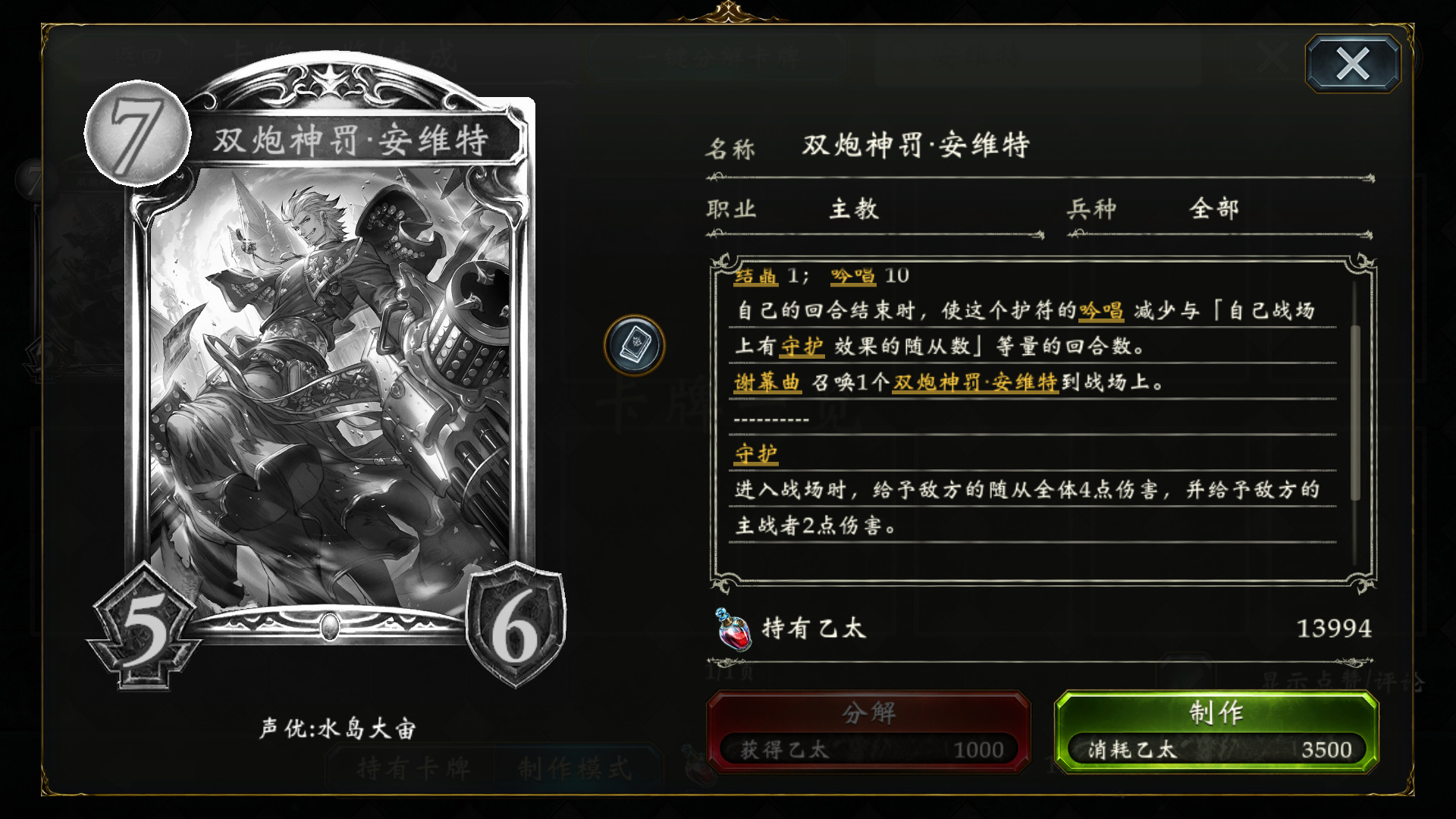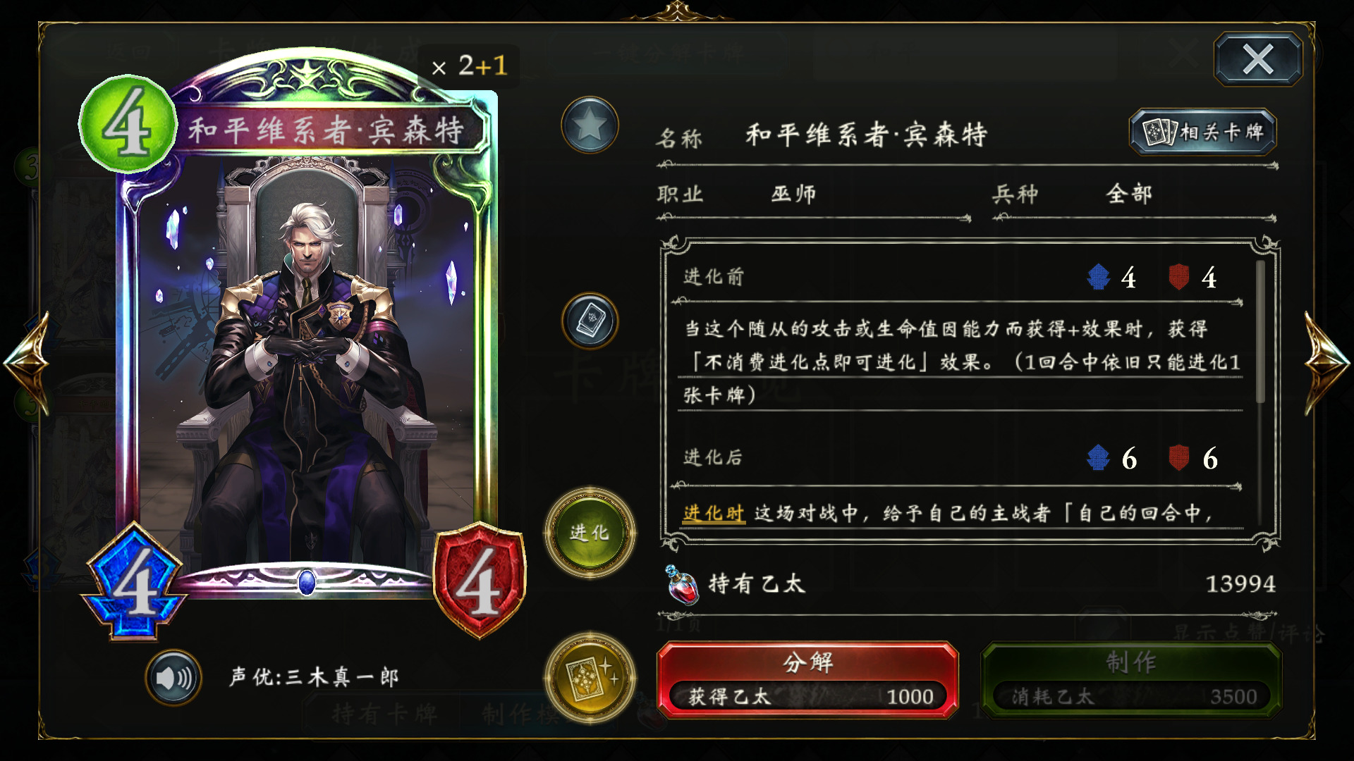 和平维系者·宾森特:言灵哥,永远滴神。配合载具免费进化,言灵是每使用3张同名法术就会触发一次全场打3AOE,而我们同名法术不要太多。中后期解场和斩杀的重要保障,但是本身4费有些笨重,而且有稳定检索手段,开局抽到不留,中期在场面安全的情况下打出。带1或者2都行。