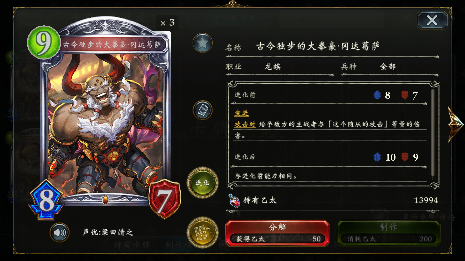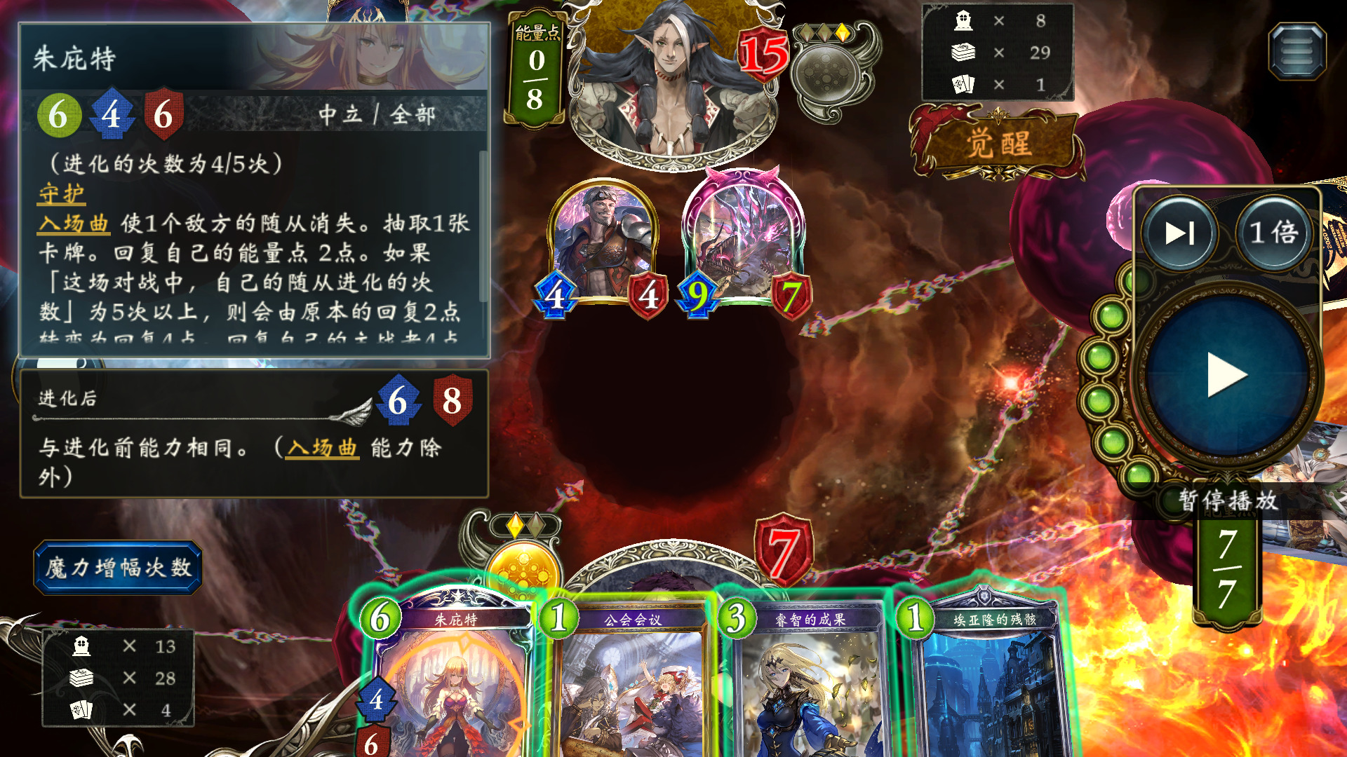 这里我们的进化次数还差一次才够5,先打出朱庇特消失97,进化撞44,然后用公会奶5,确保不会被进化独步古今的大拳豪·刚特克泽 秒杀。