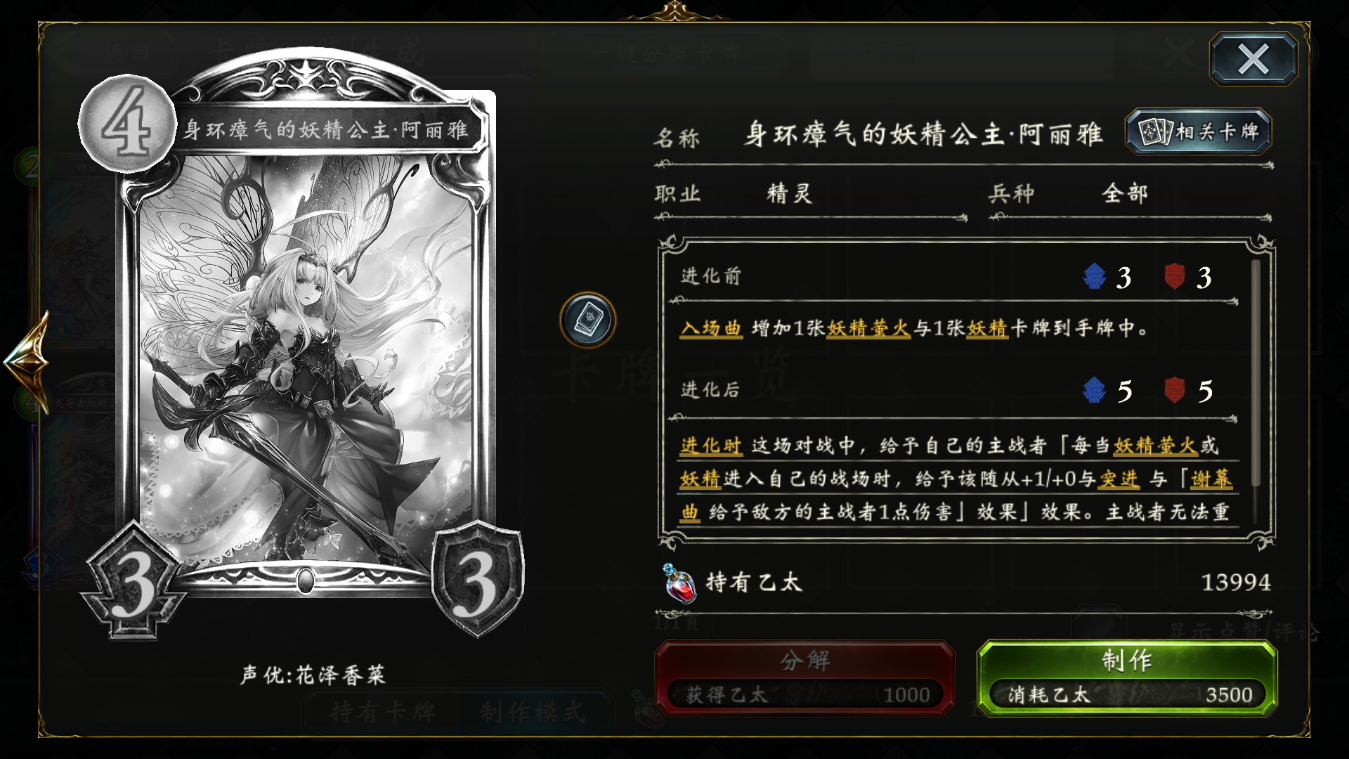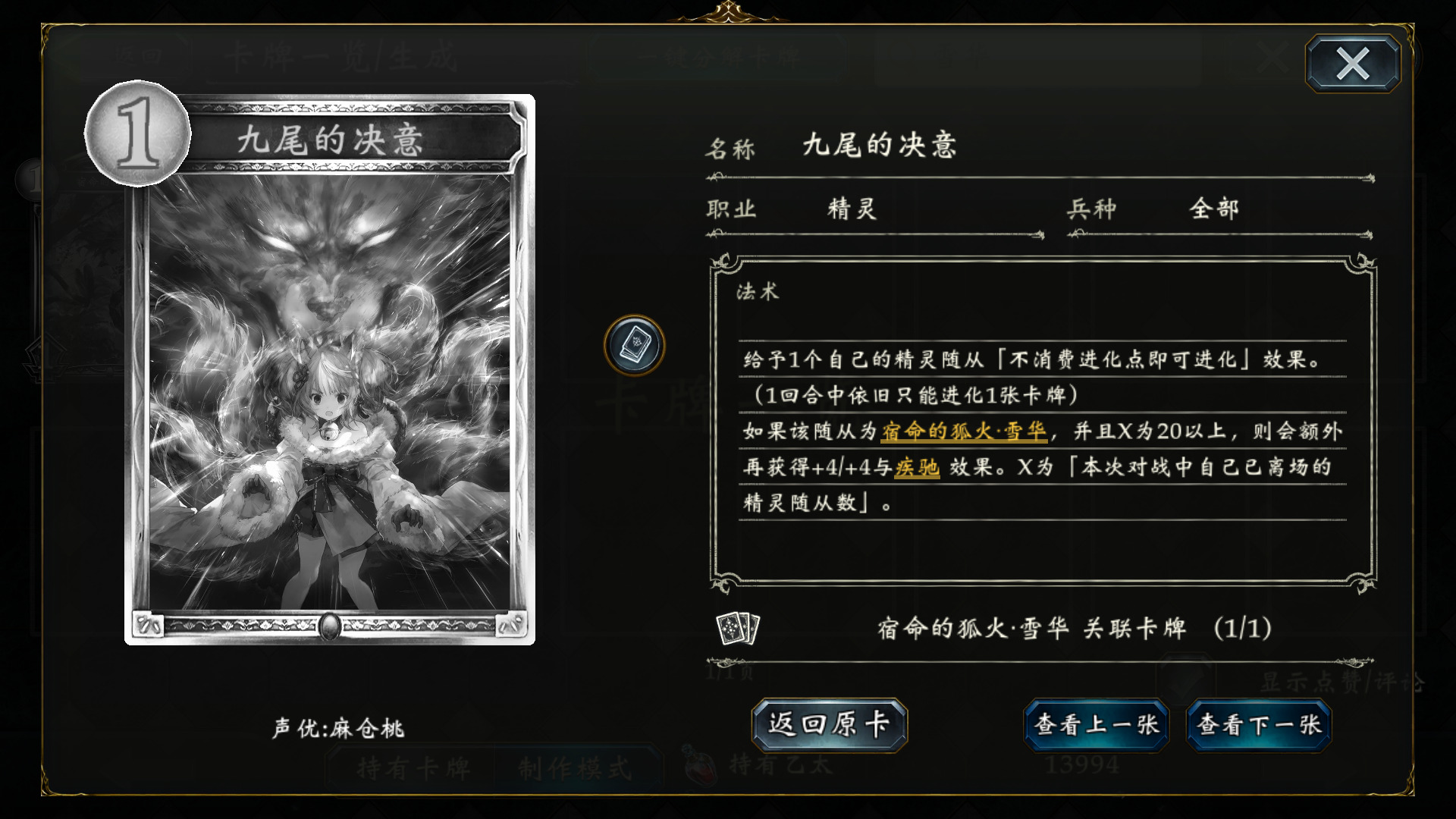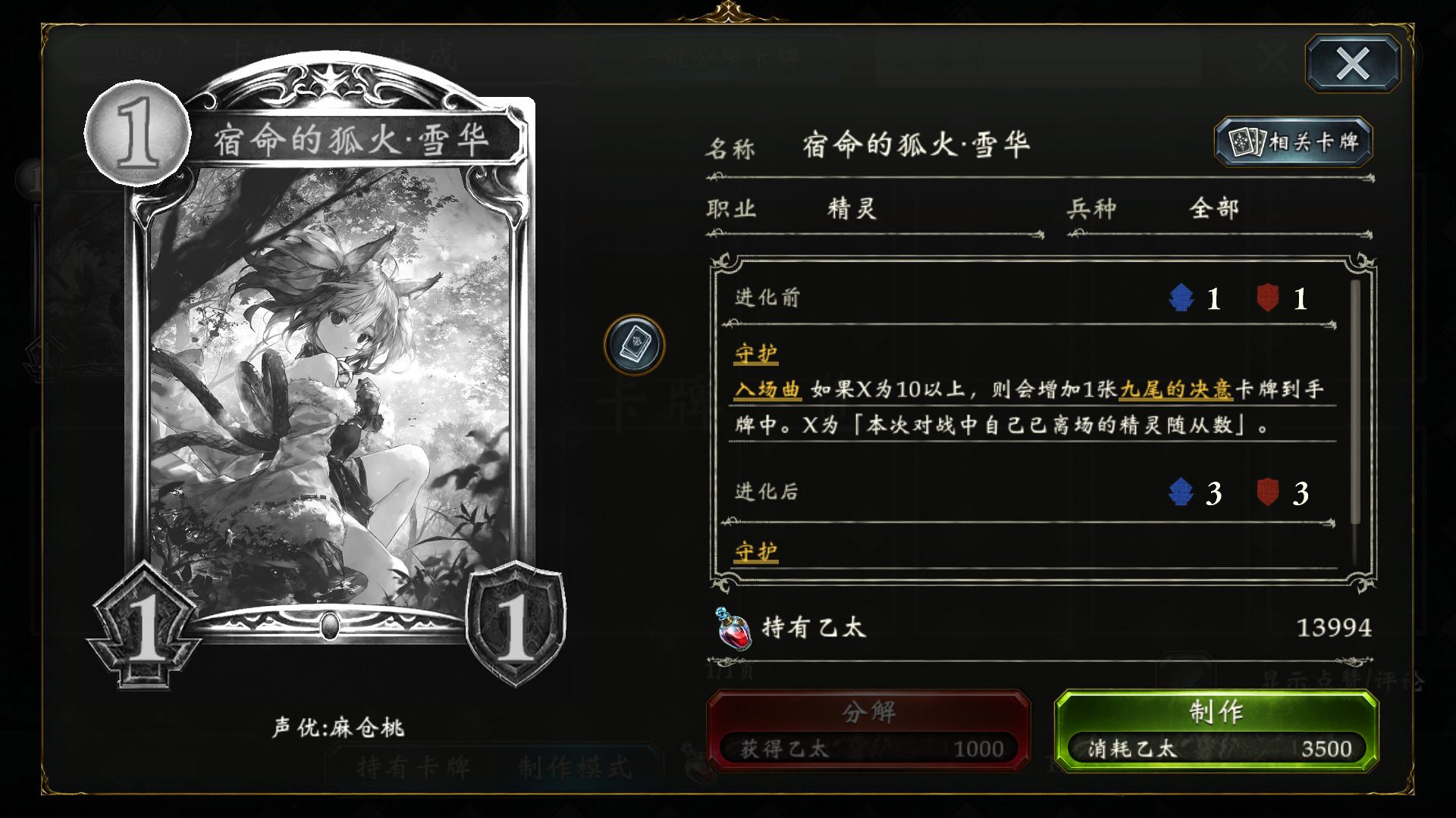 妖的游戏计划很明确,1~6c解场,做任务,同时通过疾驰杂毛蹭血,回手,积攒斩杀组件,7C之后用宿命的狐火·雪华 或万绿的回归·拉缇卡 打出超高斩杀。需要注意的是,妖的解场和回复能力都非常强劲,尤其在身环瘴气的妖精公主·阿丽雅 登场之后,轻松解光我们场面,因此铺场抢血思路行不通。