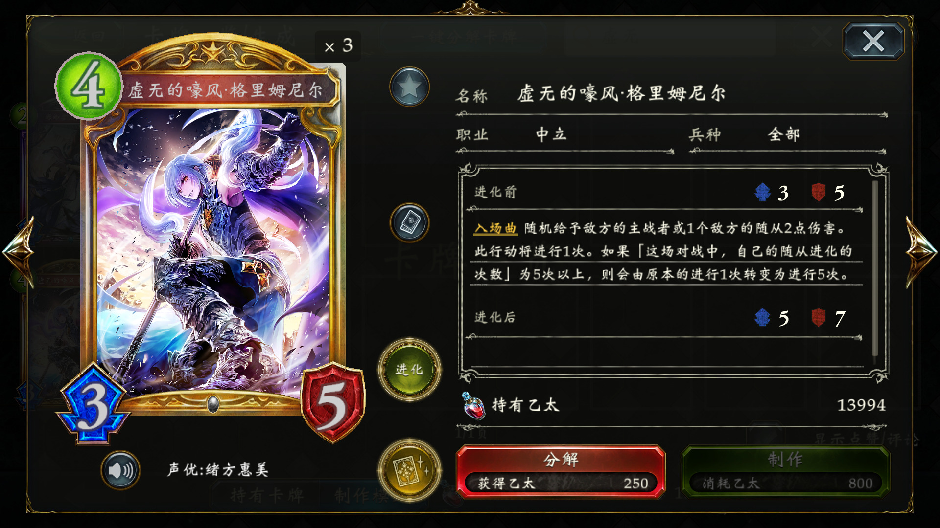 虚无的嚎风·格里姆尼尔 :进化体系老朋友了,补充伤害的重要手段,但是前期基本下不去,多了卡手,带2足够。需要注意的是,风军的伤害是5X2,而不是10X1,这个细节有时候会成为是否错斩的关键。切记,对方场上有怪的话,先触发言灵,再下风军。