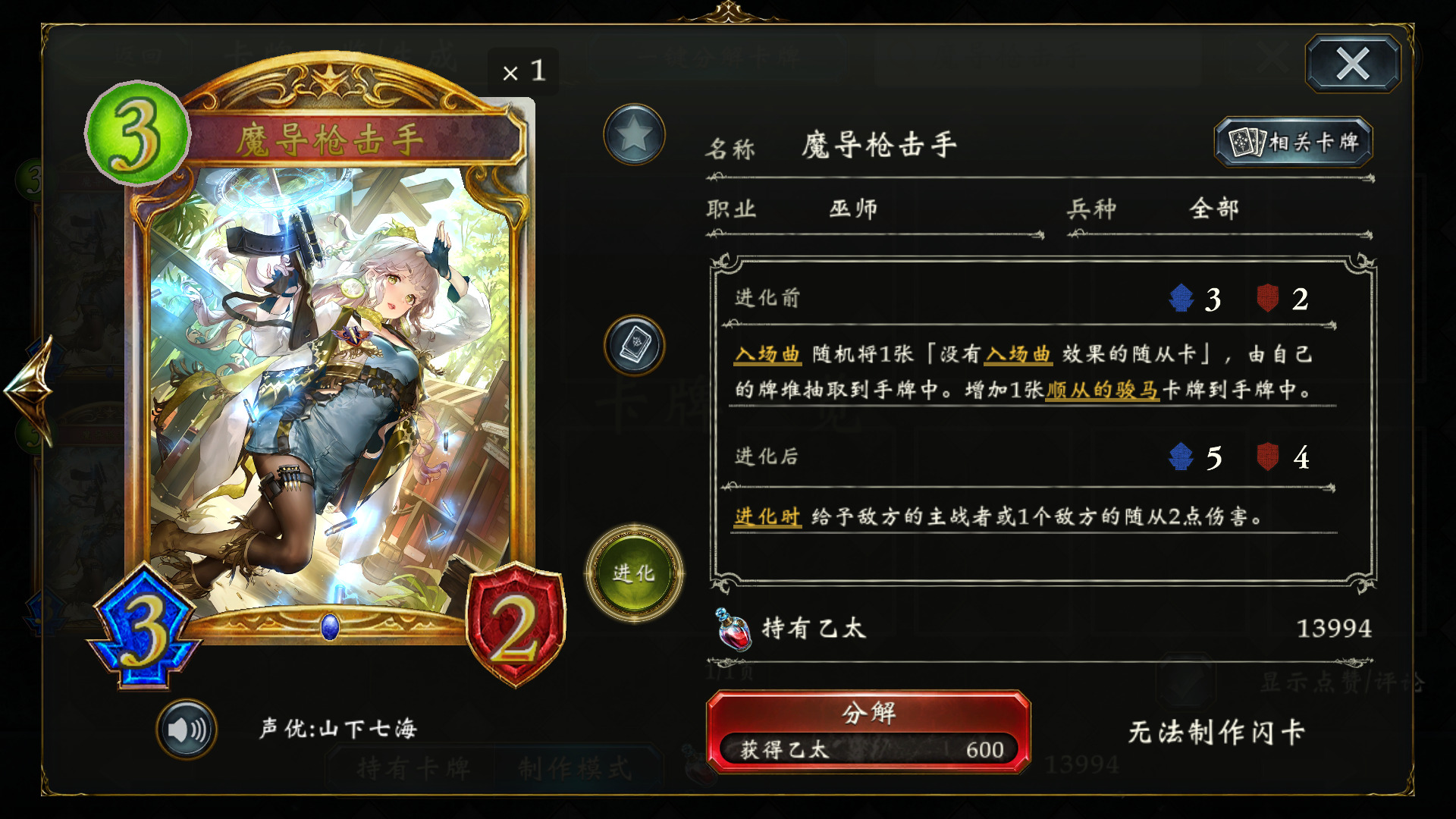 魔导枪击手 :稳定检索绽花魔术师·玛莉和和平维系者·宾森特,同时提供载具,偶尔能进化双解,先手3C最佳动作之一。但因为需要检索的也就两张卡,所以不需要多,带2。