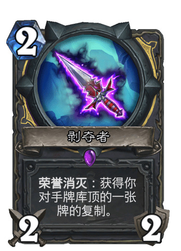 作为一张发现卡,理所当然的上限高下限低,可以发现其他职业的随从是加分项,但是尴尬的在于亡语随从的池子和巨龙宝藏。和亡语贼、剽窃贼都能打上关系,但是效果可能都不太好吗,而且值得注意的是,终极随从快退环境了。