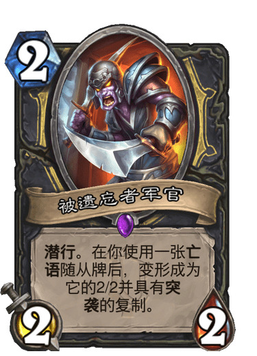 被遗忘者军官本身自带的潜行属性令自身有了生存能力,能够更好的配合亡语随从的下场触发出自己的效果,同时也能配合暗心贤者进行过牌,为了契合亡语和潜行的思路,我在卡组中加入了间谍女郎和一费海盗作为前期曲线,团伙劫掠的作用也在这时 体现出来了,可以获得额外的亡语效果装备牌和海盗,达成更好的配合。