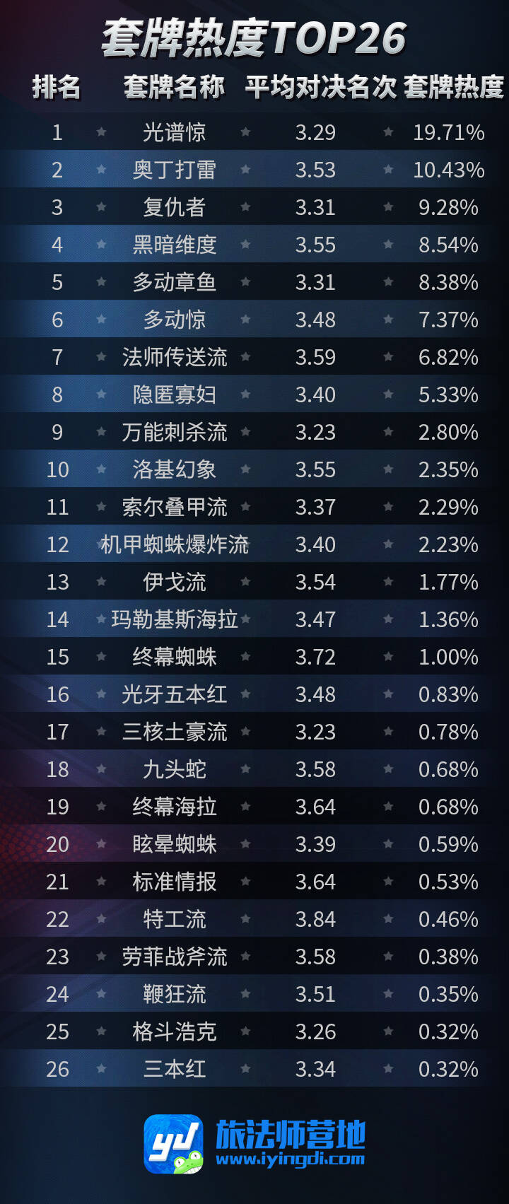 以下数据来自于大数据统计,不代表卡组强度,仅做数据参考: