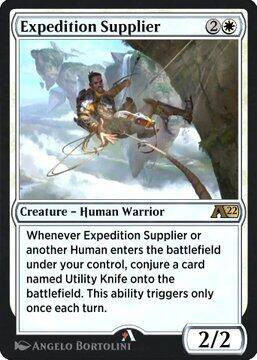 每当~或另一个人类在你的操控下进战场时,将一张名为万用刀具的牌放进战场,一回合只能触发一次。