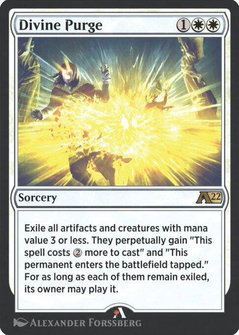 放逐所有法术力值3费或以下的神器和生物。它们永久获得“此咒语增加2施放”和“此永久物须横置进战场”。只要这些牌持续被放逐,其操控者便可以使用之。