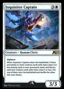 警戒,当~进战场时,如果你的坟墓场,手牌和牌库中有20或更多张法术力值小于或等于3的生物牌,套两张法术力值小于等于3的生物牌。将其中一张放进战场,另一张洗入你的牌库。