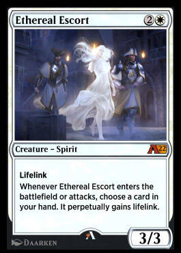 每当一张生物牌从你的牌库或手牌被置入坟墓场时,它永久得“当此牌离开你的坟墓场时,派出一个横置的2/2黑色灵俑衍生生物”。