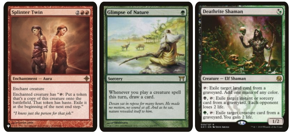 瞥视自然是一张从摩登出现就被禁掉的卡。它在薪传和标准的组合技套牌,尤其是妖精滚雪球中证明了自己的实力。技术上来讲,瞥视自然在摩登里也能同样运作,依靠传承德鲁伊产出大量费用把整个牌库搬空,然后靠陨蹄贝西摩斯终结比赛。但是这里有两个重要的理由支持瞥视自然在摩登里是一张合理的单卡。