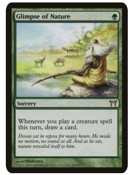 第二,我们实际上有一些类似的牌,比如招引//呼叫以及和谐仪式,它们比瞥视自然多一费,干的事儿都差不多,但这两张牌完全没人在摩登用过(除了在一个短暂的档口里,招引//呼叫和瓶中脑出现过诡异的互动)。这两者都可以形成妖精滚雪球式的组合技,但是那一个都没能让它实现。我们论证了二费双色的瞥视自然在摩登属于不可用单卡,那么我建议可以试一试一费的原来版本。