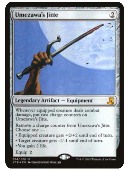 今年冬天,我们即将回归神河,恰是老神河最具代表性的单卡重回摩登的好时机。梅泽的十手同样也来自摩登最初的禁牌表,它功能性强,是个集回血、去除、膨胀于一身的强力武具,却从来没能在摩登里施展过拳脚。十手在薪传中确实有用量,常在死税和曾哥套牌中出场。不过它的光辉已经大不如前了,因为不少曾哥剑的牌表已经不再选择带它。