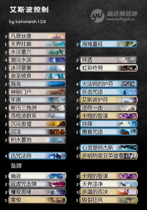 比较令人惊讶的是这套极其传统的艾斯波控制也能在主牌0幽寂的情况下,能获得还不错的成绩,相较于之前的艾斯波控制,为了处理当下生物套牌较多的环境,主牌带上了两张坏透,既能作点杀又能当扫场,相当灵活;卡娅的智谋也像之前的环境一样好用,现在还能很好的针对通念师猫卡组。所以其实现在的环境也还是比较包容的,只要能找到适合自己的套牌,多少都能打出一点成绩,总不能每一局都碰上天敌卡组把~