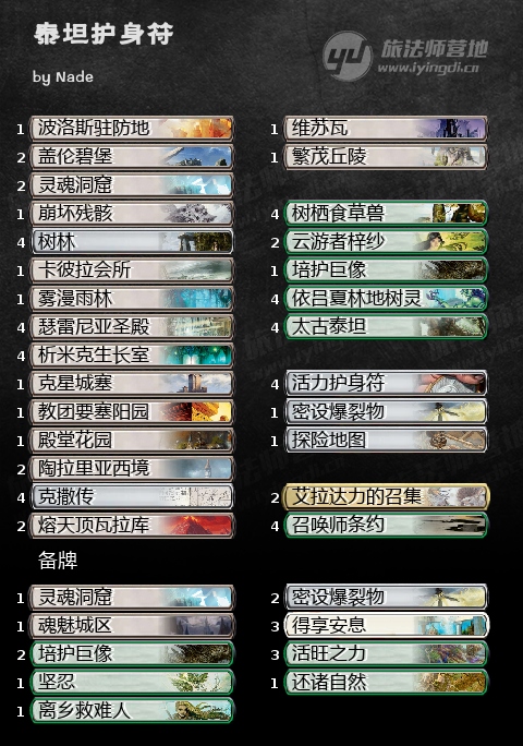 这套泰坦护身符有点不太一样,算是正经的掺入了白色作为套牌运作的一部分,不过也就是引进了主牌的2张白绿导师、1张密设爆裂物和备牌的坟场针对。因为6张导师的存在,培护巨像可能只需要前期的第一张就可以帮助套牌展开。