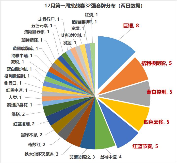 Hello小伙伴们大家好啊,我是星陨五丈原。大家都看到了,本周的封面还是格影,倒不是因为多……而是这周两场都是格影卷了,甚至是同一位牌手,恐怖。另外,本周的meta很怪,除了巨锤依然最多,第二多的套牌竟有4套,让我们一起来看看具体的meta分布吧: