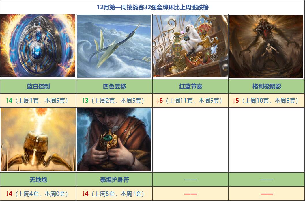 本周的单套牌涨跌很丰富,环比上周上涨方面,蓝白控制环比上涨4套,四色云移环比上涨3套,本周都有5套进入32强;下降方面,同样是5套进入32强,红蓝节奏和格影分别环比上周下降了6套和5套,但是格影他卷了啊!红蓝节奏惨啊,此外无地炮和泰坦护身符也都环比下降了4套: