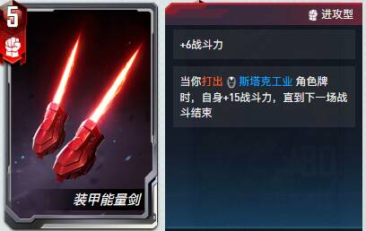 答:能量剑+6面板,回合内每打出一个斯塔克机甲,会给携带者增加15的即时攻击。而三张百夫长才能增加21的面板。并且抛开鞭狂的吞噬能力,不断打出机甲单位,即时攻击会不断叠加,在没有鞭狂的时候,我们可以通过这件装备给场上的进攻型角色佩戴去强势过度,如蚁人,叶莲娜,(张老六:能量剑给狗带都能C的动)(冰酒:是能量剑不配么?我觉得能量剑才是唯一核心)也是第二核心一哥的启动器。而百夫长的优势。在于稳健,有一个稳定的面板增益,但是占格子,过于死板只能给斯塔克单位增加,在没搜到鞭狂的情况下,难以撑住场,不如能量剑灵活。