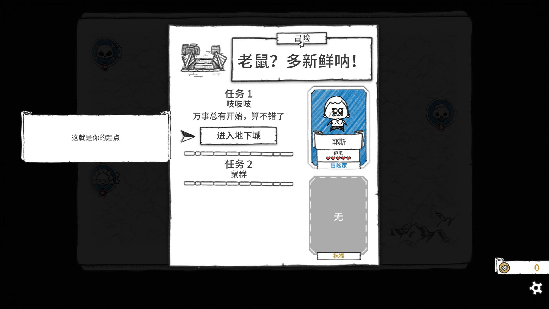 总之,既然有冒险家了,我们也可以开始探险了!我们的耶斯先生的职业是**,emm,那就不让他从事什么难干的事了,就去打打老鼠吧!