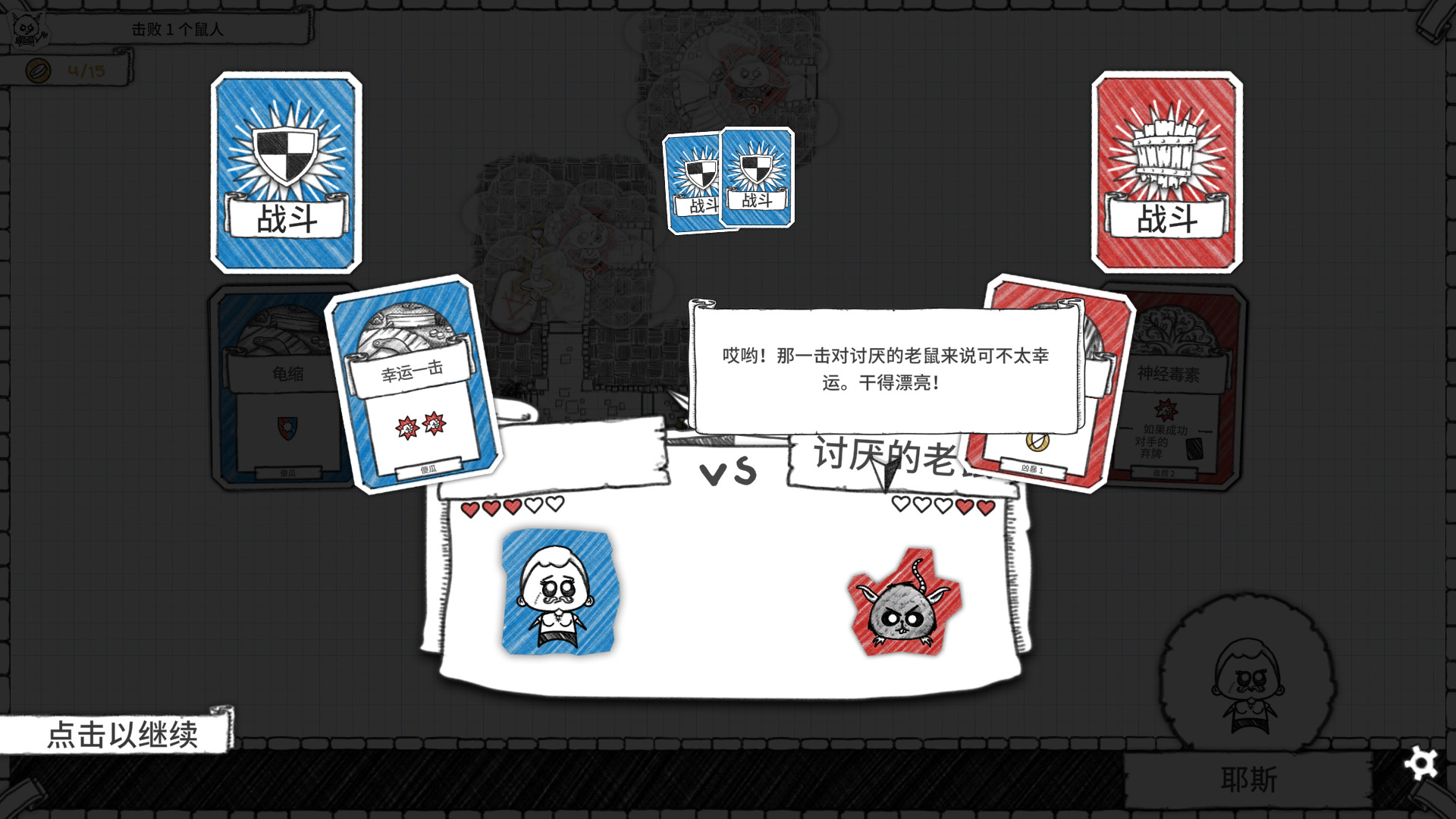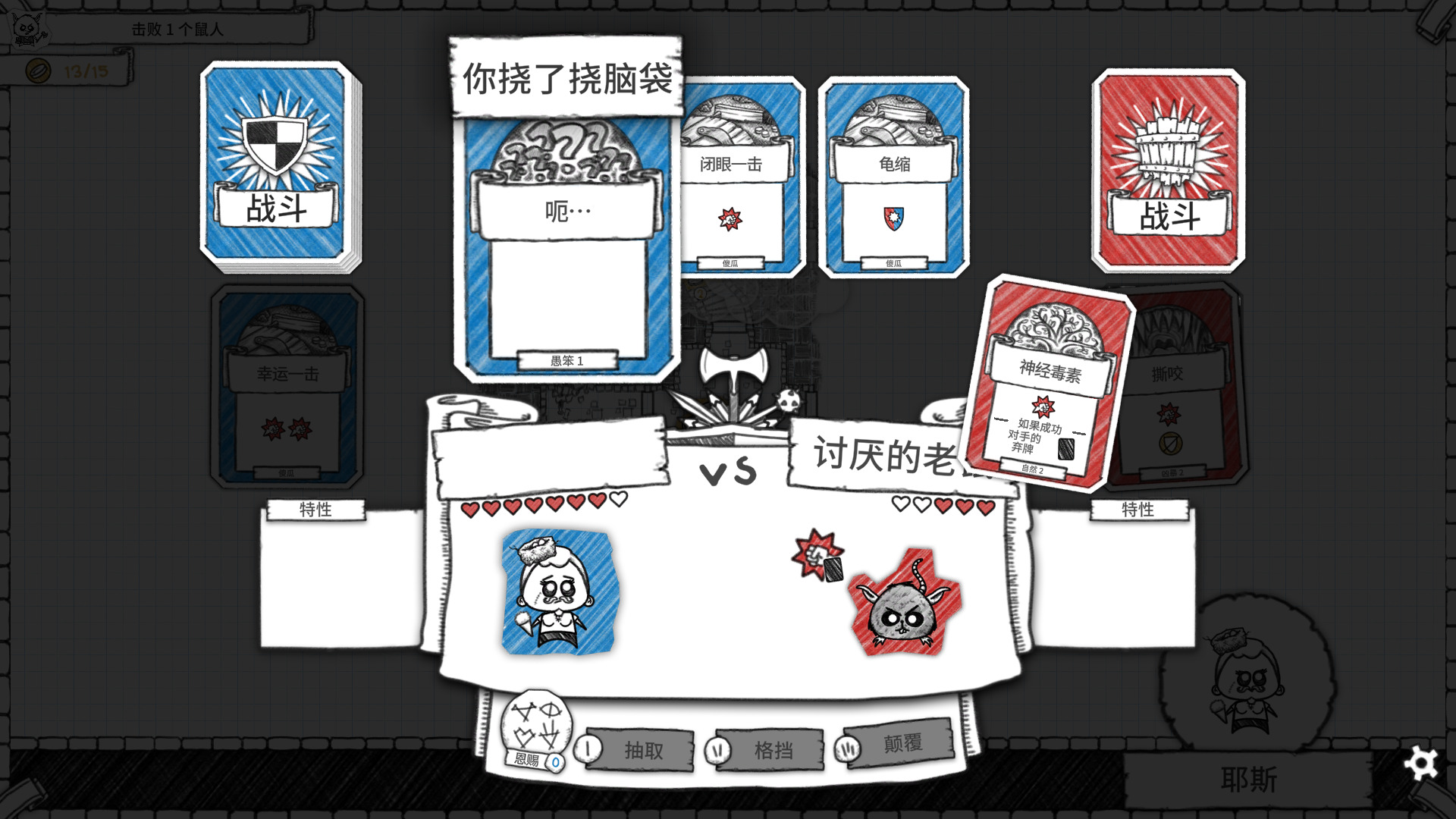 游戏的战斗系统采用的是最古板的回合制,并没有现如今流行的combo流,每次战斗都是敌人先手,但我们可以知道对方要做什么,然后从抽到的牌里进行反击。只不过一开始的耶斯先生是个**,没有什么太厉害的牌和技能。